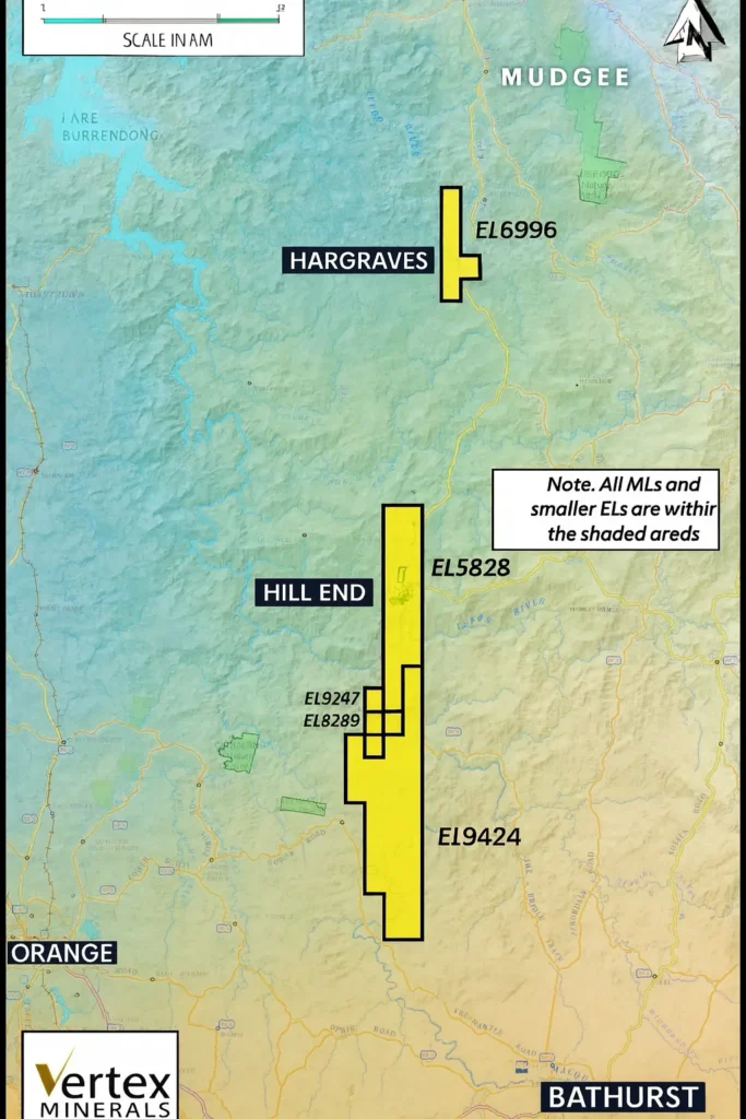 Seven (7) granted exploration licences – EL 5868, 8289, 9247, 9434 & 9413 at Hill End and 6996 & 9485 at Hargraves;