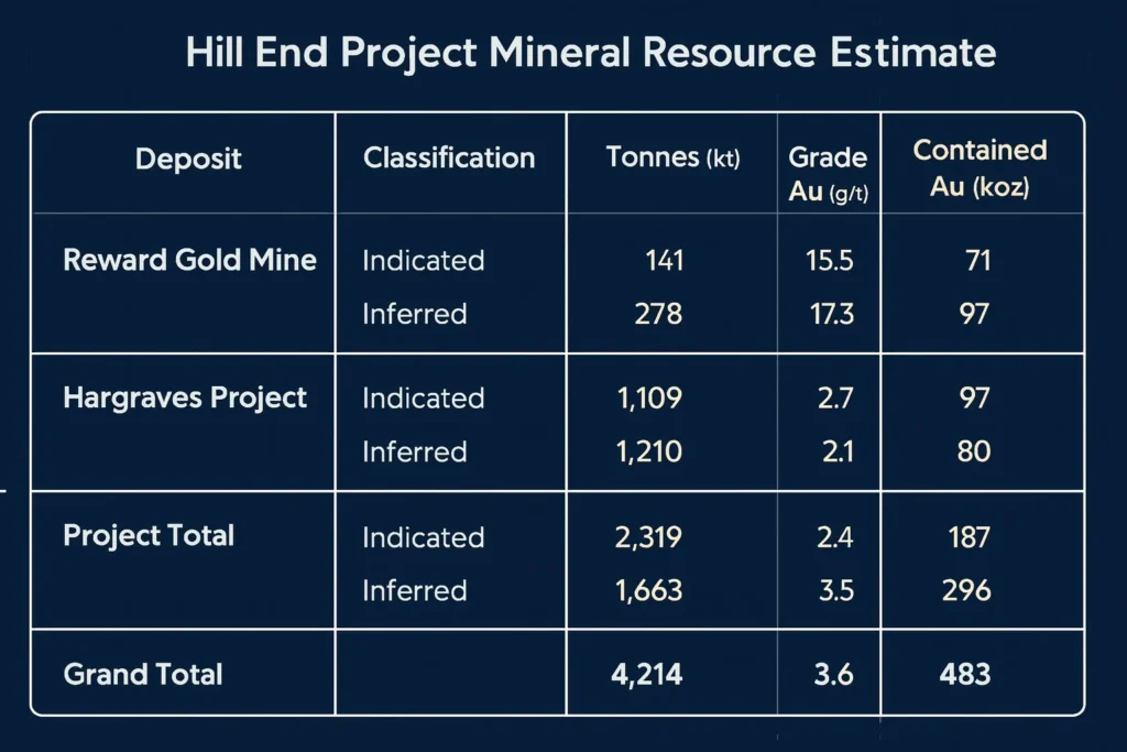 The Hill End Project comprises of Mineral Resource located at the Reward Gold Mine, Red Hill Project and Hargraves Project. Total contained gold stands at 483,000 ounces.